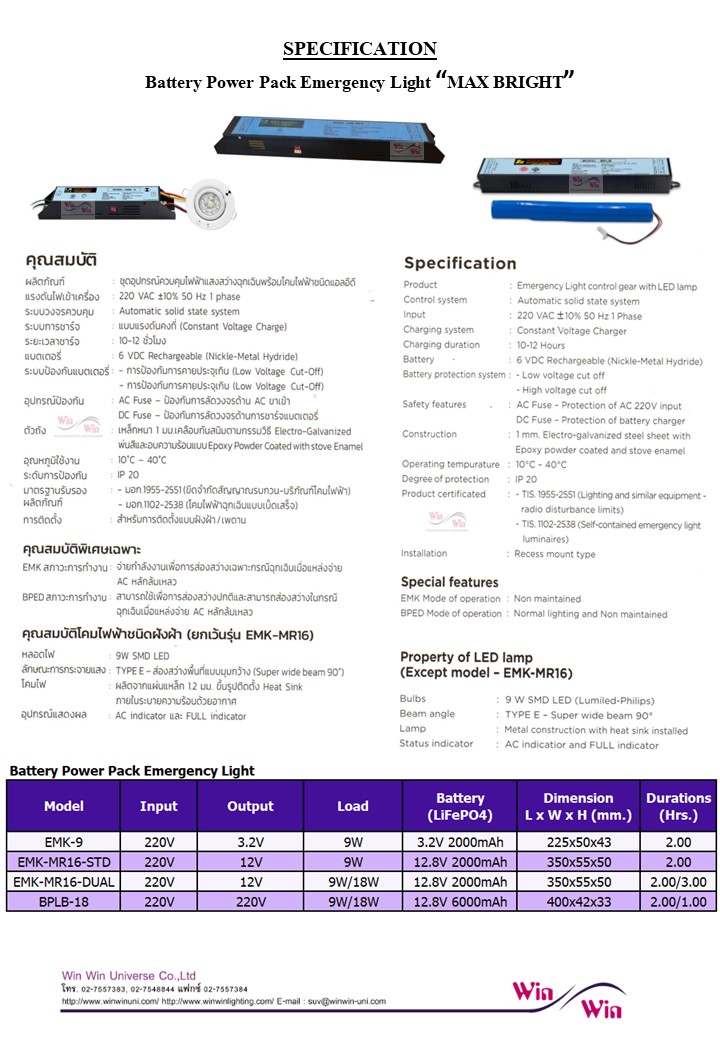 Battery Pack Emergency Light Kit ชุดคิทไฟฉุกเฉิน สำหรับติดตั้งกับโคมไฟ Down light 6V 9W มีให้เลือกใช้แบบ Maintain หรือ Non-Maintain สามารถ ปิด/เปิด หลอดไฟ และเมื่อไฟฟ้าดับ หลอดจะติดสว่างขึ้นมาทำหน้าที่เป็นไฟฉุกเฉิน