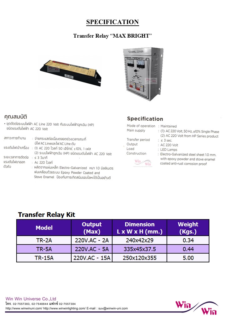 Transfer relay อุปกรณ์ต่อพ่วงสำหรับการติดตั้ง Central Emergency light เพื่อให้สามารถติดตั้งสวิตช์ ปิด/เปิด หลอดไฟฉุกเฉินได้ โดยใช้ร่วมกับ Transfer Relay จะทำให้สามารถ เปิด-ปิดหลอดไฟฉุกเฉินจุดนั้นๆได้ เมื่อเกิดไฟฟ้าดับ หลอดไฟดวงนั้นจะติดสว่างขี้นมาเป็นไฟฉุกเฉินได้โดยอัตโนมัติ -