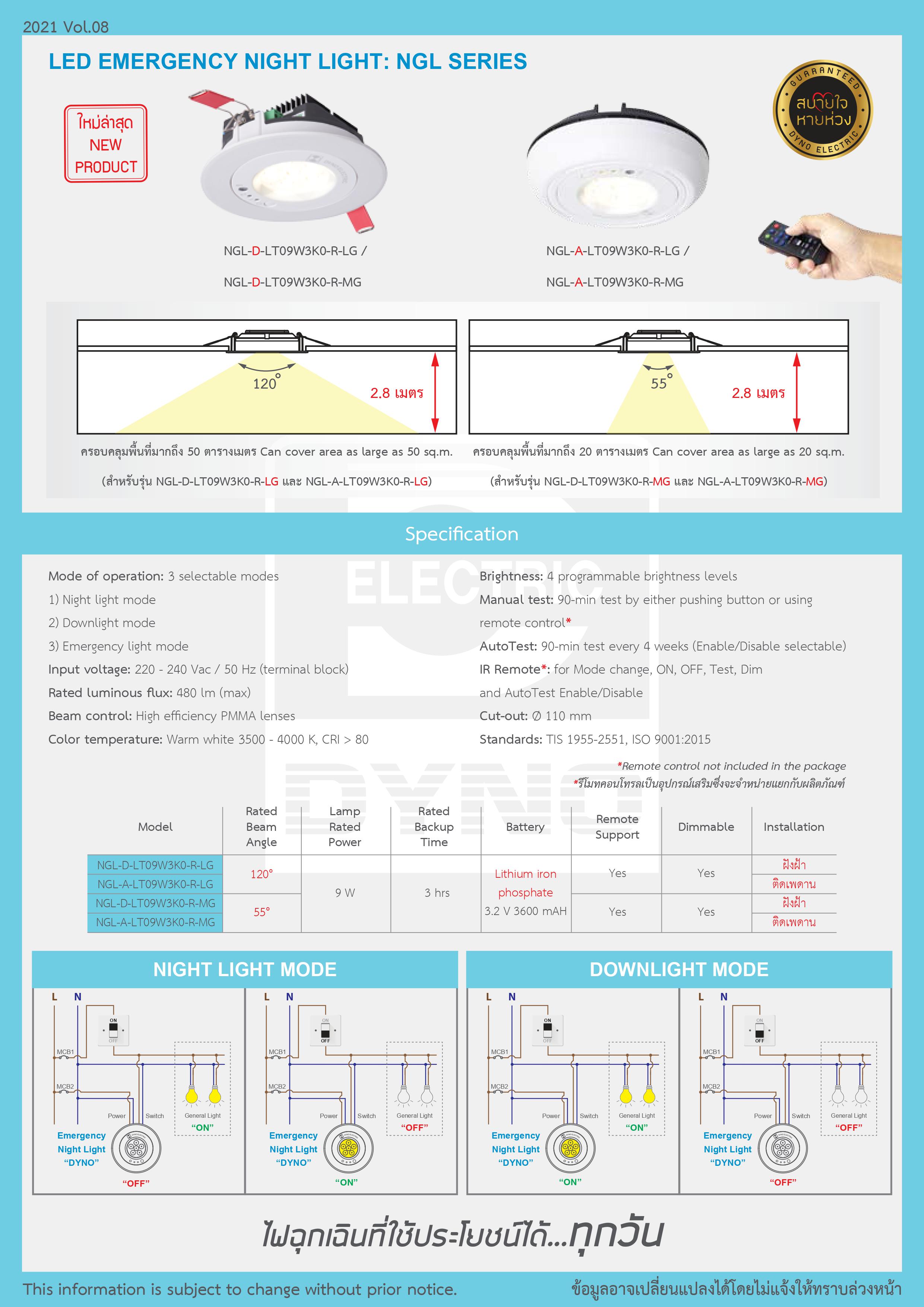 โคมไฟฉุกเฉินชนิดแบตเตอรี่ในตัวรุ่น LFG Series หัวโคม 2x9W และ 2x12W สามารถปรับความสว่างได้ถึง 4 ระดับ สำรองไฟได้ไม่น้อยกว่า 2 ชั่วโมง และมีการทดสอบตัวเองอัตโนมัติตามมาตรฐานของวสท. -