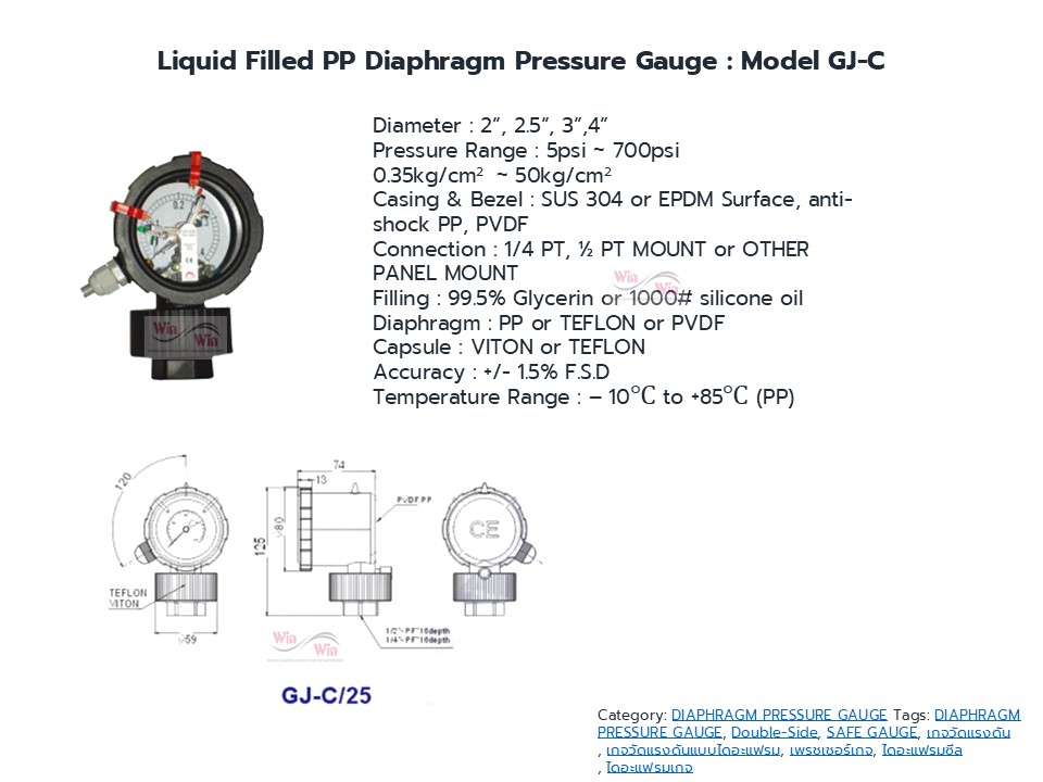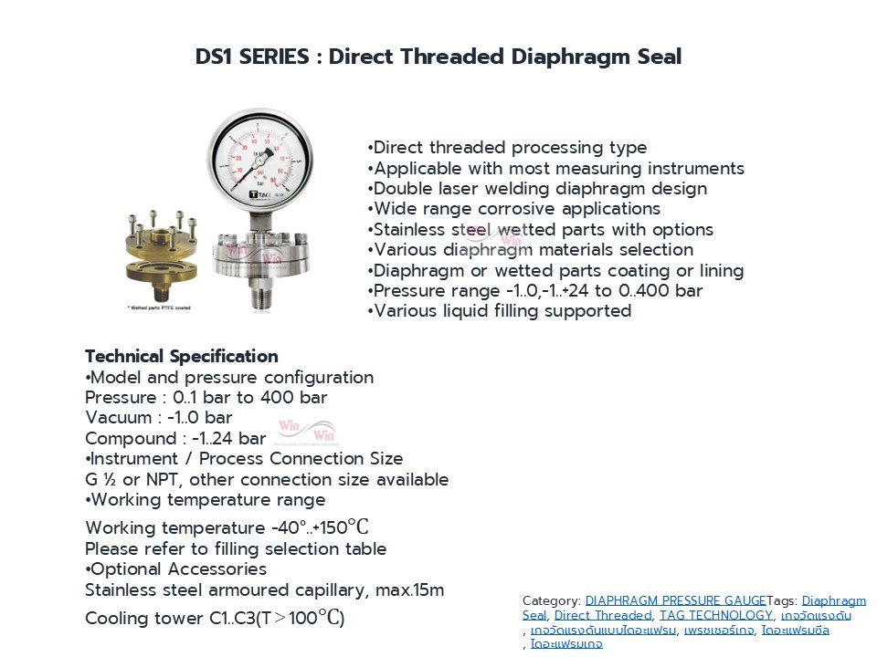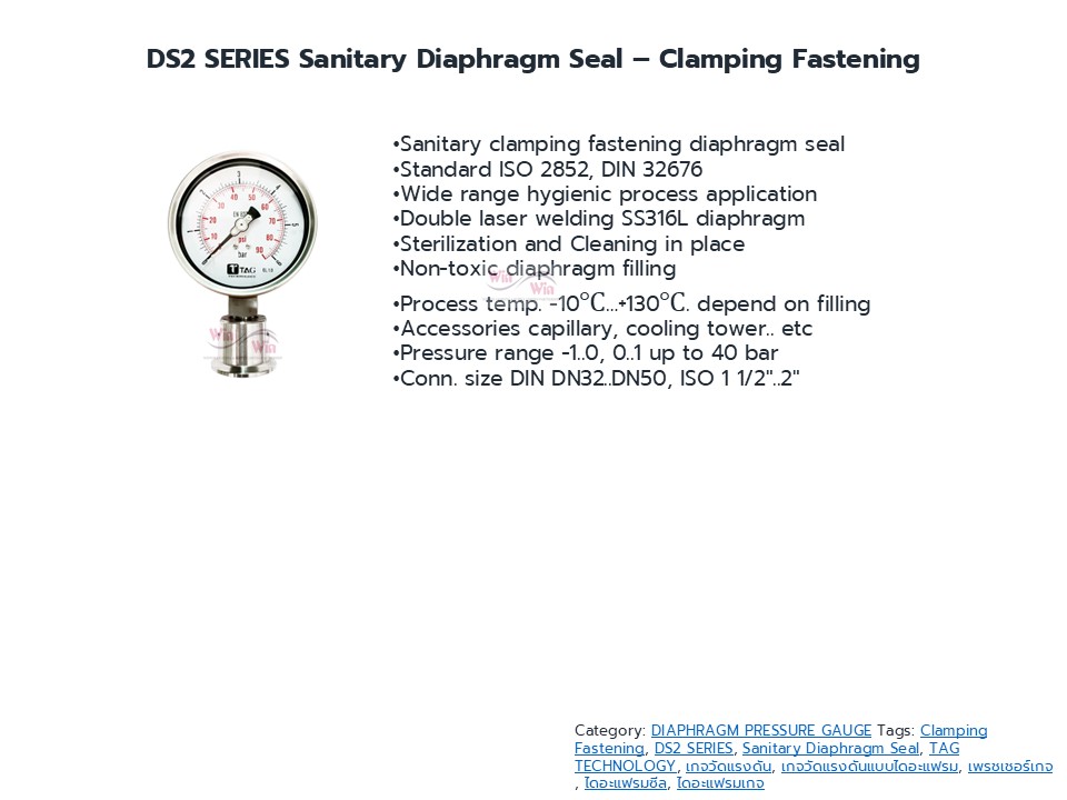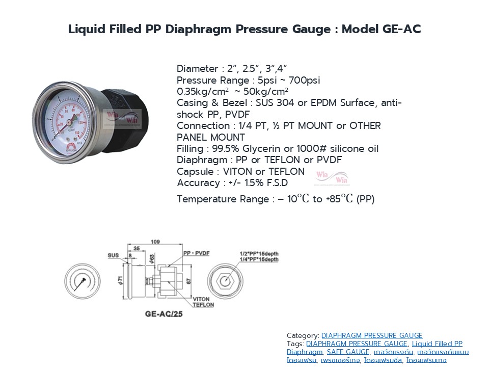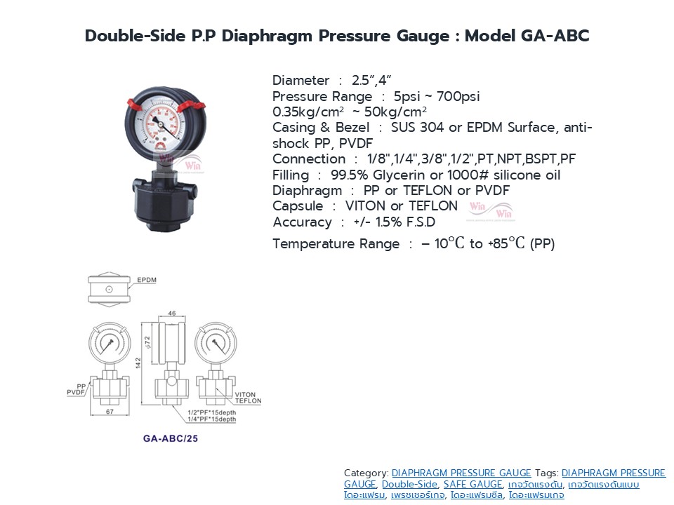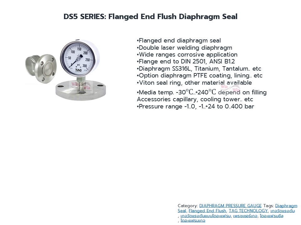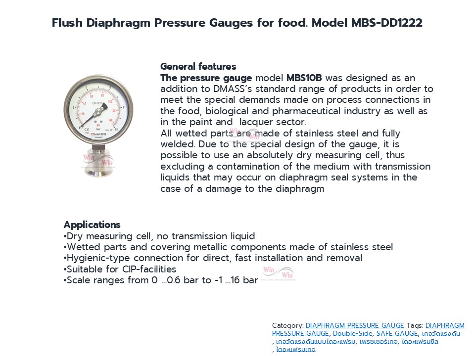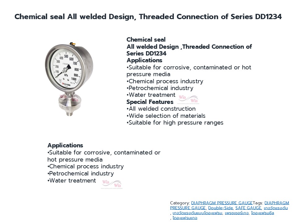 Diaphragm Gauge ไดอะแฟรมเกจ เกจวัดแรงดันที่มีอุปกรณ์ตัวกลางส่งผ่านแรงดันในท่อ ในถัง ระบบอัดแรงดัน โดยที่เกจจะไม่สัมผัสกับ ระบบหรืองานในกระบวนการนั้นเลย เหมาะสำหรับงานสารเคมี งานอาหาร งานที่มีสารกัดกร่อน งานที่มีอุณหภูมิสูง ทำให้เกจวัดแรงดันได้เที่ยงตรงและมีอายุการใช้งานยาวนาน